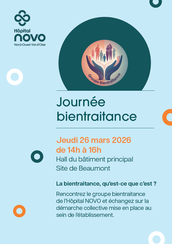 À l'occasion de la journée de la bientraitance, le groupe bientraitance de l'Hôpital NOVO sera présent sur les sites de Pontoise, Beaumont et Aincourt pour rencontrer les professionnels, patients et usagers.